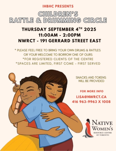 Join us on Thursday, September 4, 2025, from 11:00 am to 2:00 pm for a children's rattle and drumming circle. Snacks and TTC tokens provided. For more info please email Lisa@nwrct.ca.