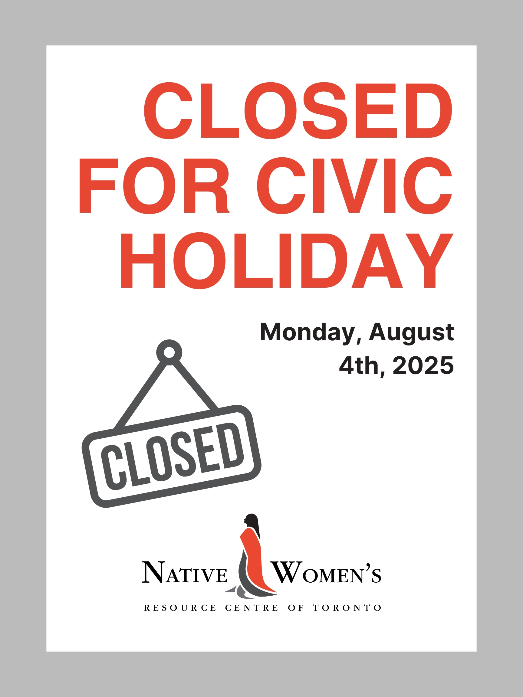 The Native Women's Resource Centre of Toronto will be closed on Monday, August 4th, 2025. We will re-open on Tuesday, August 5th, 2025.