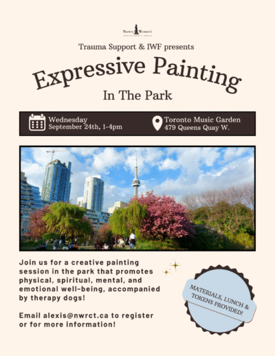 Join us on Wednesday, September 24, 2025, from 1:00 to 4:00 pm for expressive painting at the Toronto Music Garden. Please email alexis@nwrct.ca to register.