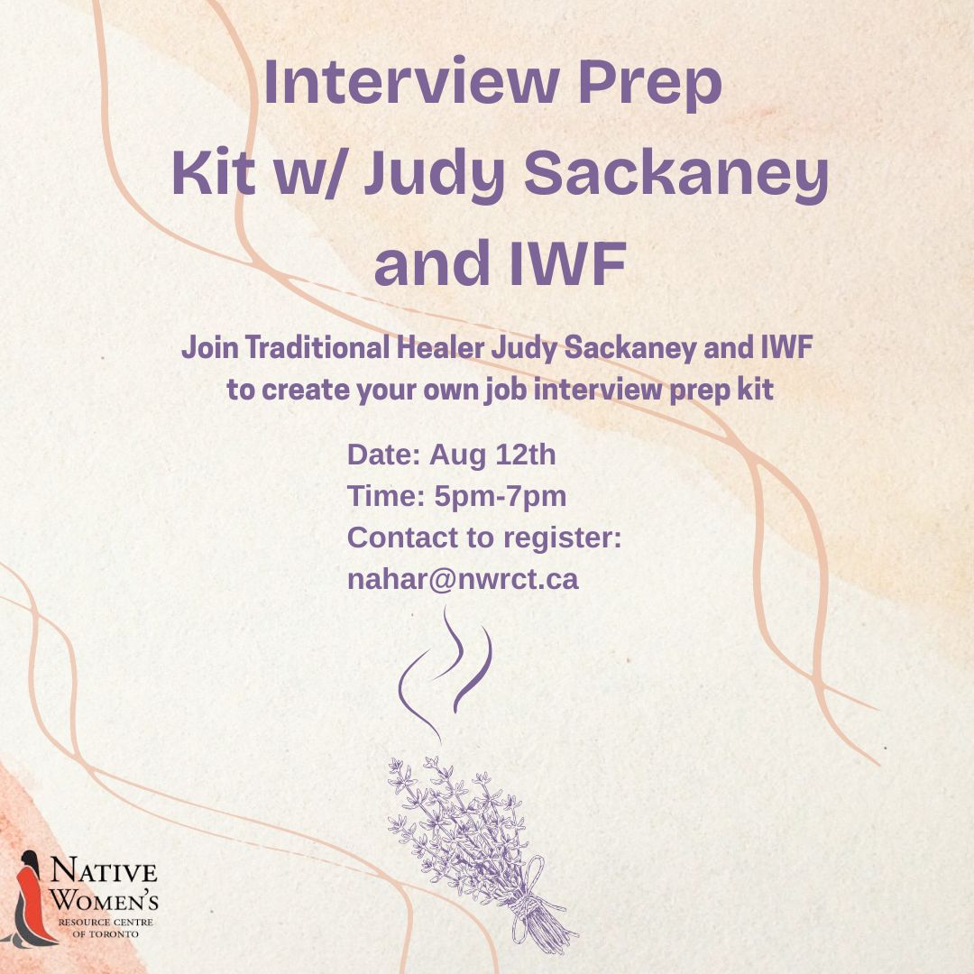 Join Traditional Healer Judy Sackaney and IWF to create your own job interview prep kit on August 12, 2025 from 5:00 pm to 7:00 pm. Email nahar@nwrct.ca to register.