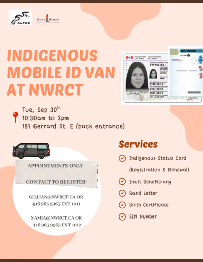 Join us on Tuesday, September 30, 2025, from 10:30 am to 2:00pm to schedule an appointment with Indigenous Mobile ID Van. See poster for details. Email gillian@nwrct.ca or samia@nwrct.ca to register for an appointment.