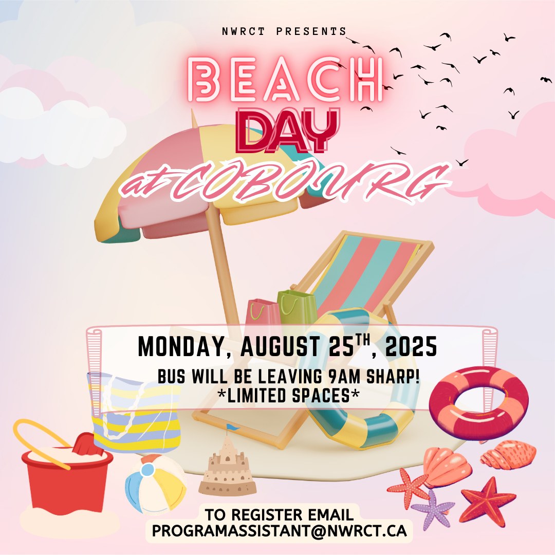 Join NWRCT for a community Beach Day at Cobourg on August 25, 2025; the bus leaves at 9:00 am from 191 Gerrard St. East (return time shared upon registration). Limited spaces—register at programassistant@nwrct.ca.