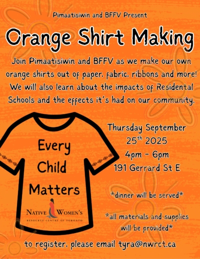 Join BFFV and Pimaatisiwin on Thursday, September 25, 2025, from 4:00 pm to 6:00pm as we create our own orange shirts from paper, fabric, ribbons, markers, stickers and more! We will also learn the about the impacts the Residential School system has had on our community, and still has today. To register, email tyra@nwrct.ca.