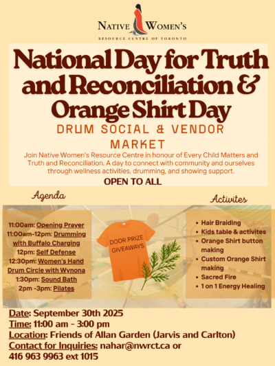 Join us on Tuesday, September 30, 2025, from 11:00 am to 3:00pm in honour of Every Child Matters and Truth and Reconciliation. A day to connect with community and ourselves through wellness activities, drumming, and showing support. Email nahar@nwrct.ca or 416 963 9963 ext 1015 for inquiries, See poster for details.