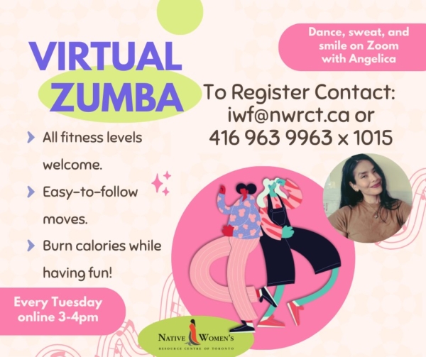 Join us every Tuesday for virtual Zumba lessons with Angelica on ZOOM from 3 pm to 4 pm. No experience is necessary. Just bring water, comfortable clothing, and a smile! Please email IWF@nwrct.ca to register. See poster for details.
